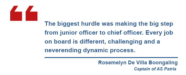 Head of Crewing Susanne Petkovic has accompanied Rosy for a long time at Wilhelmsen Ahrenkiel Ship Management: “Since I first met her, I’ve known she has a big heart. When she took over from the previous captain, she gave a ‘thank-you cake’ to Capt. Salama. I kind of feel like her mentor as I have been guiding her for such a long time. It was a long way to go for her. As a woman in the shipping industry, I always feel that women are expected to be better than men in any kind of position. But in the end, Captain Rosemelyn de Villa Boongaling convinced all of us in Wilhelmsen Ahrenkiel Ship Management that she has the potential to be the leader of one of our vessels. We trust in her.”